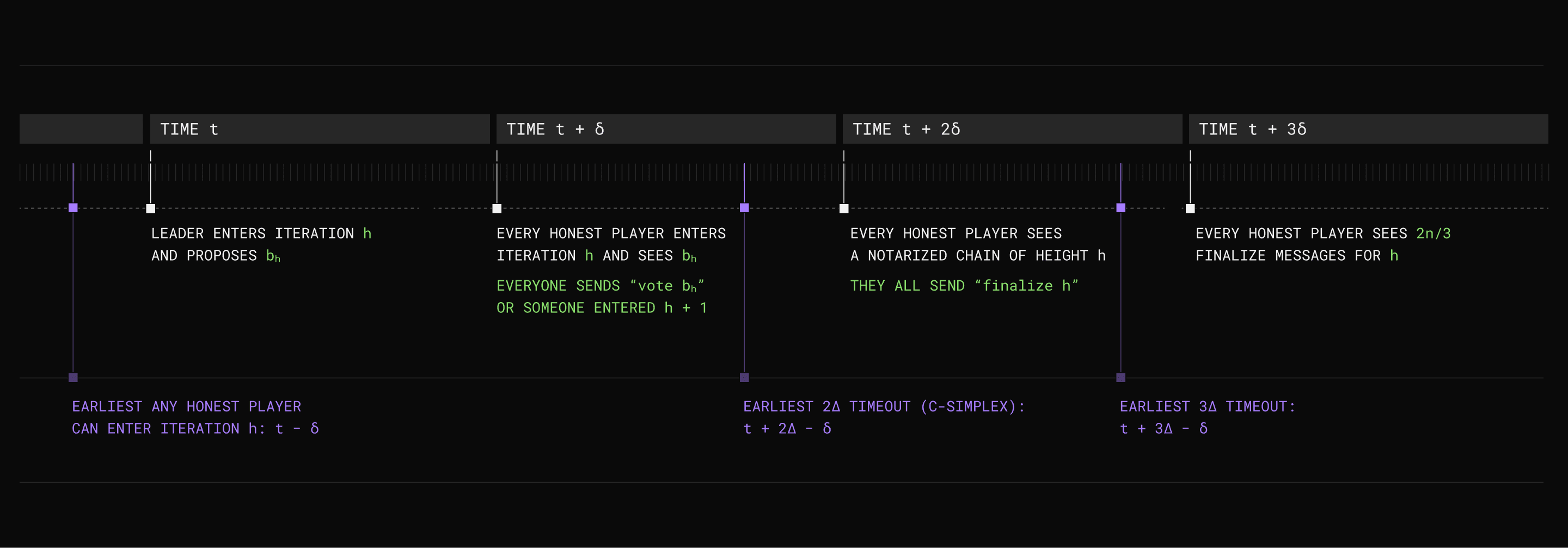 - Case (b) p's local timer Th has been fired before time t + δ. We will show that if Lh entered iteration h by time t > GST, then any honest player p's local timer can never fire before time t + δ in iteration h. To see this, we first show that p must enter iteration h after time t - δ. Otherwise, if p enters iteration h at a time before t - δ, then by Lemma 3.4, Lh must also enter iteration h exactly at time GST, which contradicts the assumption that t > GST. Consequently, because p enters iteration h after time t - δ, and because the p's local timer is set to 2∆ > 2δ, p's local timer cannot fire before time t + δ. (Notice that C-Simplex adds an additional timer at 2∆).