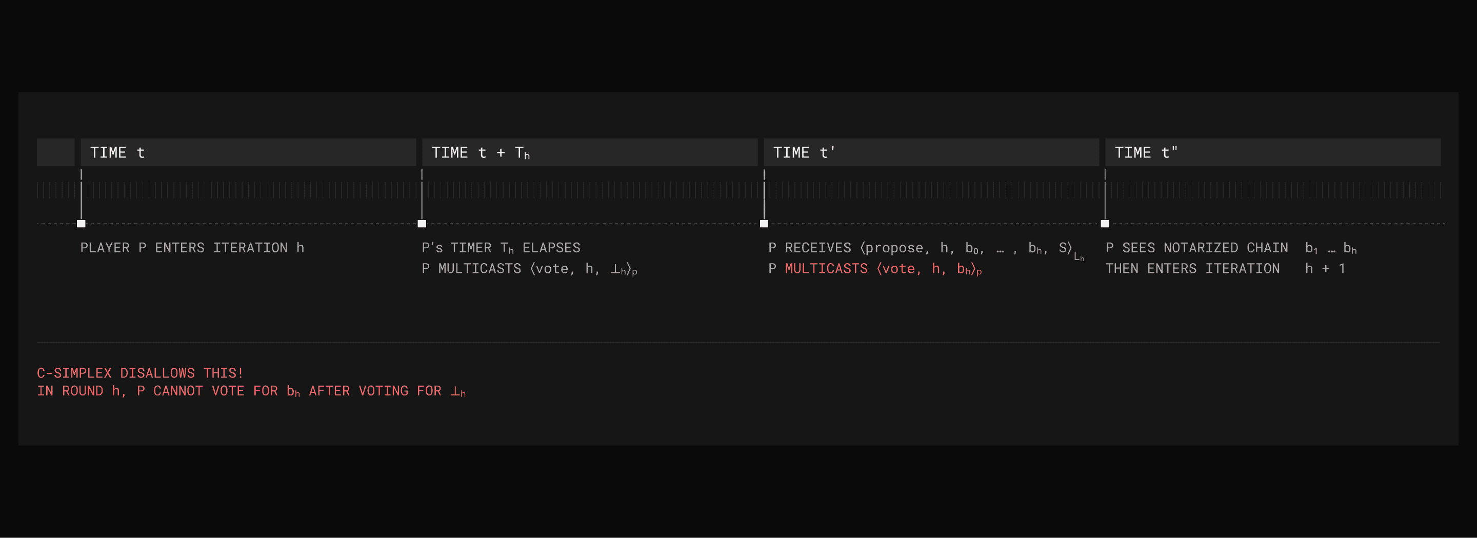 Interestingly, in Simplex, players may still vote for the leader's proposal after the timeout. This fact may be exploited by a malicious leader if the leader is incentivized to hold the proposal until after observing the notarization of the dummy block. For example, if the VRF entropy is revealed in the notarization of ⊥h, it may be used by the malicious proposer to build block bh! In C-Simplex, this behavior is disallowed, as no honest player would vote to notarize this malicious proposal after they have already voted to nullify the iteration.