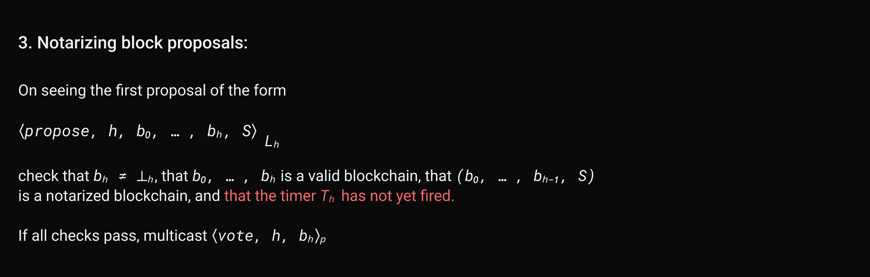 In the unmodified protocol, players vote for a proposal bh if all of the following conditions hold: (1) it is the first non-dummy proposal received from the correct leader of the iteration, (2) the proposal includes a valid blockchain, and (3) the prefix (excluding bh) is notarized. C-Simplex adds one additional check (4) the local timer Th has not yet fired.