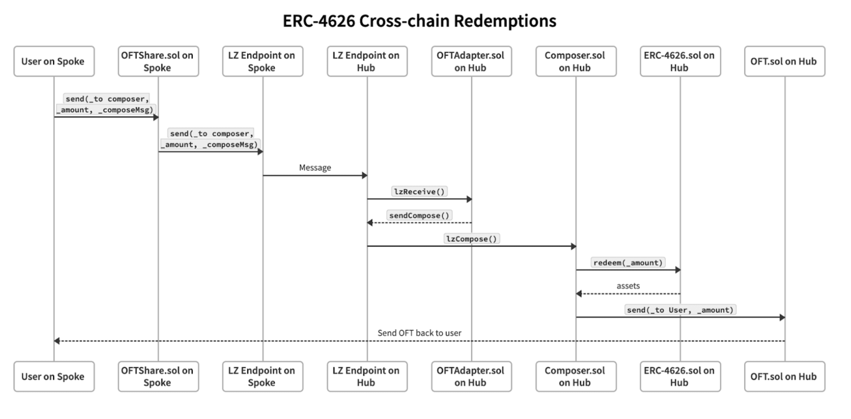 - Flexible Redemptions: Users can redeem from any chain supported by the vault provider in a single transaction. In the background, LayerZero orchestrates the withdrawal by sending Share OFTs to the composer, which returns assets to the user's origin chain.